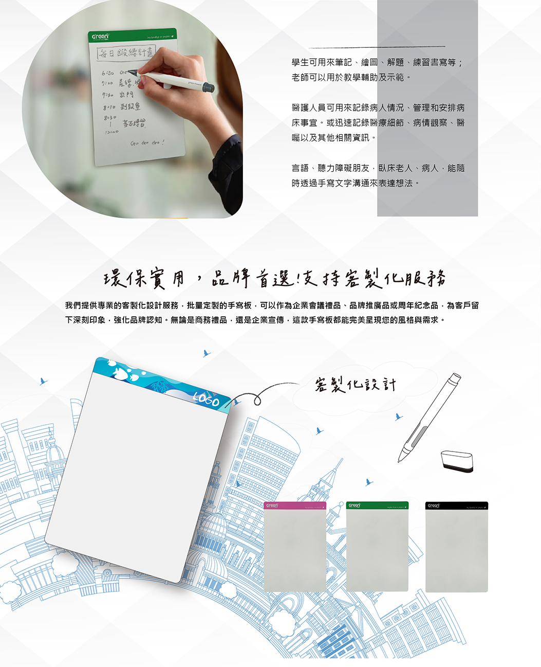 Green Board產品秉承綠色、環保與科技、生活結合的理念,在每一個需要紙張的場合提供全新的書寫工具選擇,無界限的溝通工具。Green Board 磁性手寫板為無紙化的環保書寫工具,採用了最新膠囊技術,無需電源或任何外部能源供應即可實現長期穩定的顯示效果。您可以隨意書寫、繪圖和註記,享受自由書寫的樂趣,同時為環境保護盡一份力量!